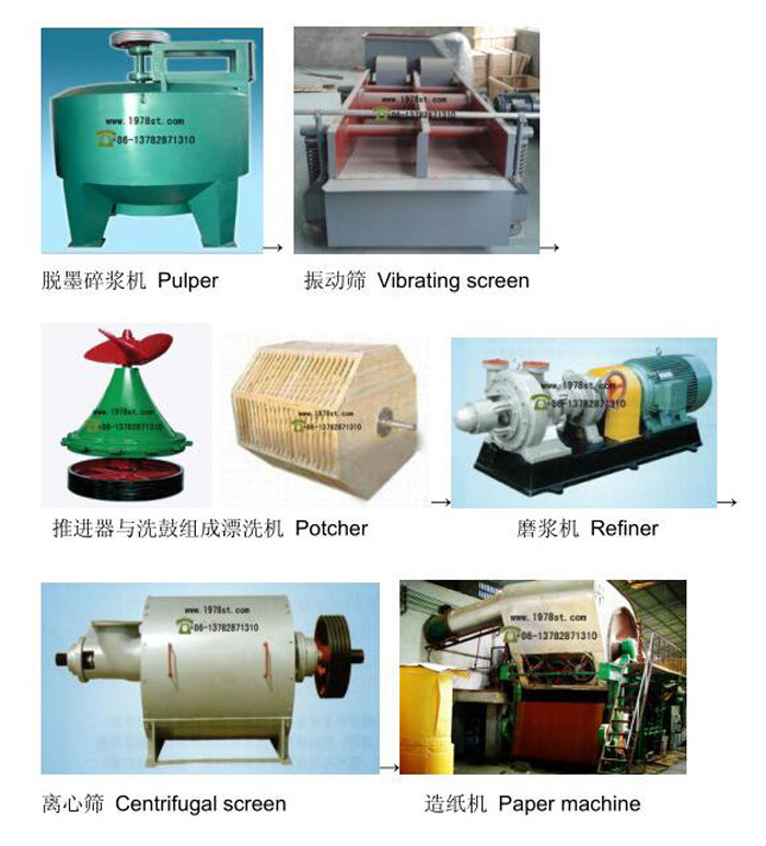 Waste paper---Pulping---Screening---Pulp washing---Defibrination---Rescreen---Size mixing---Mixed pulp---Desander---upper wire---water absorption---Drying---Reeling---Slitting---Packing---Storage